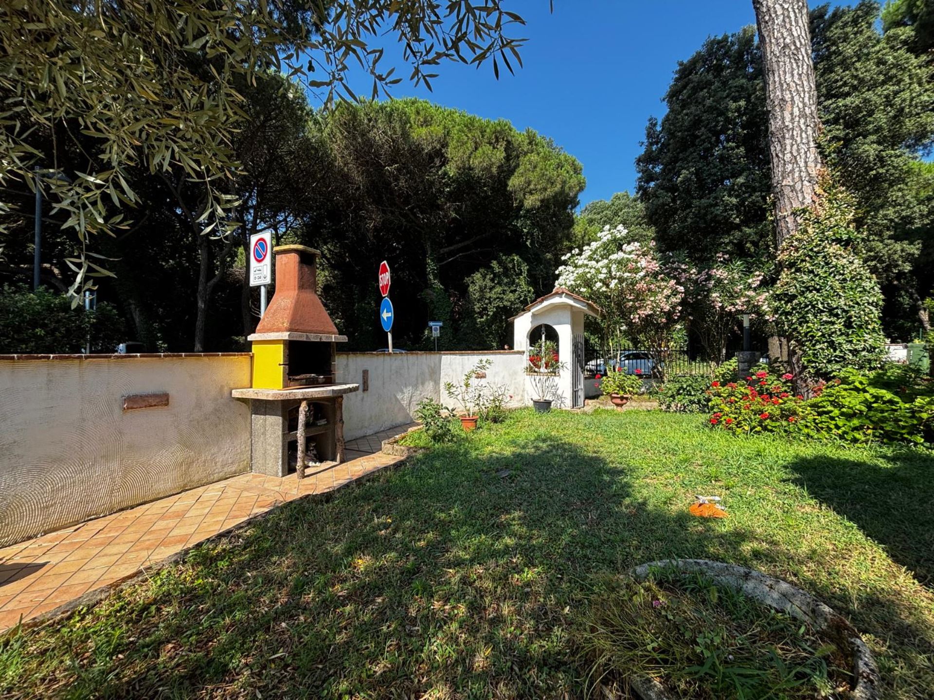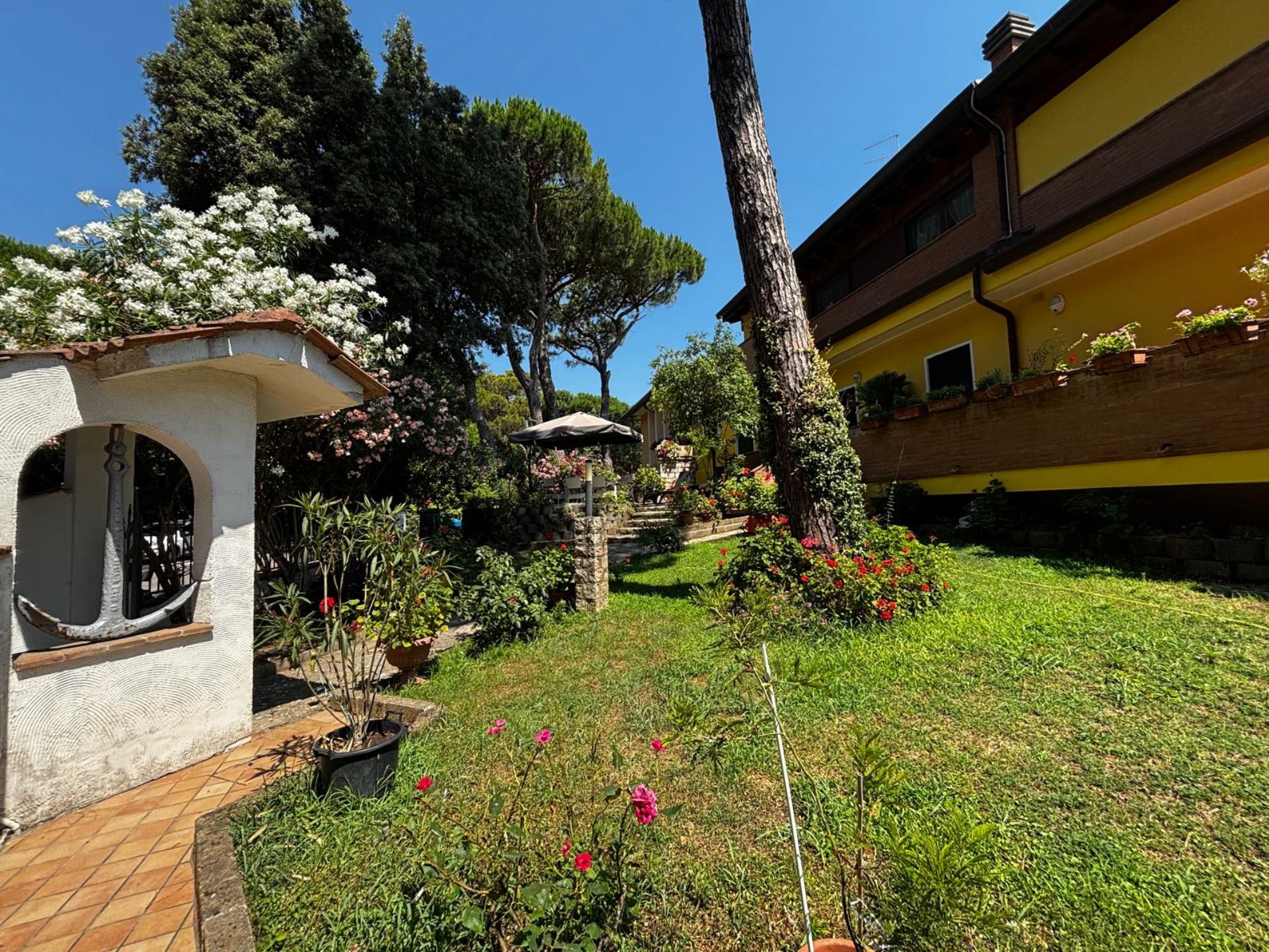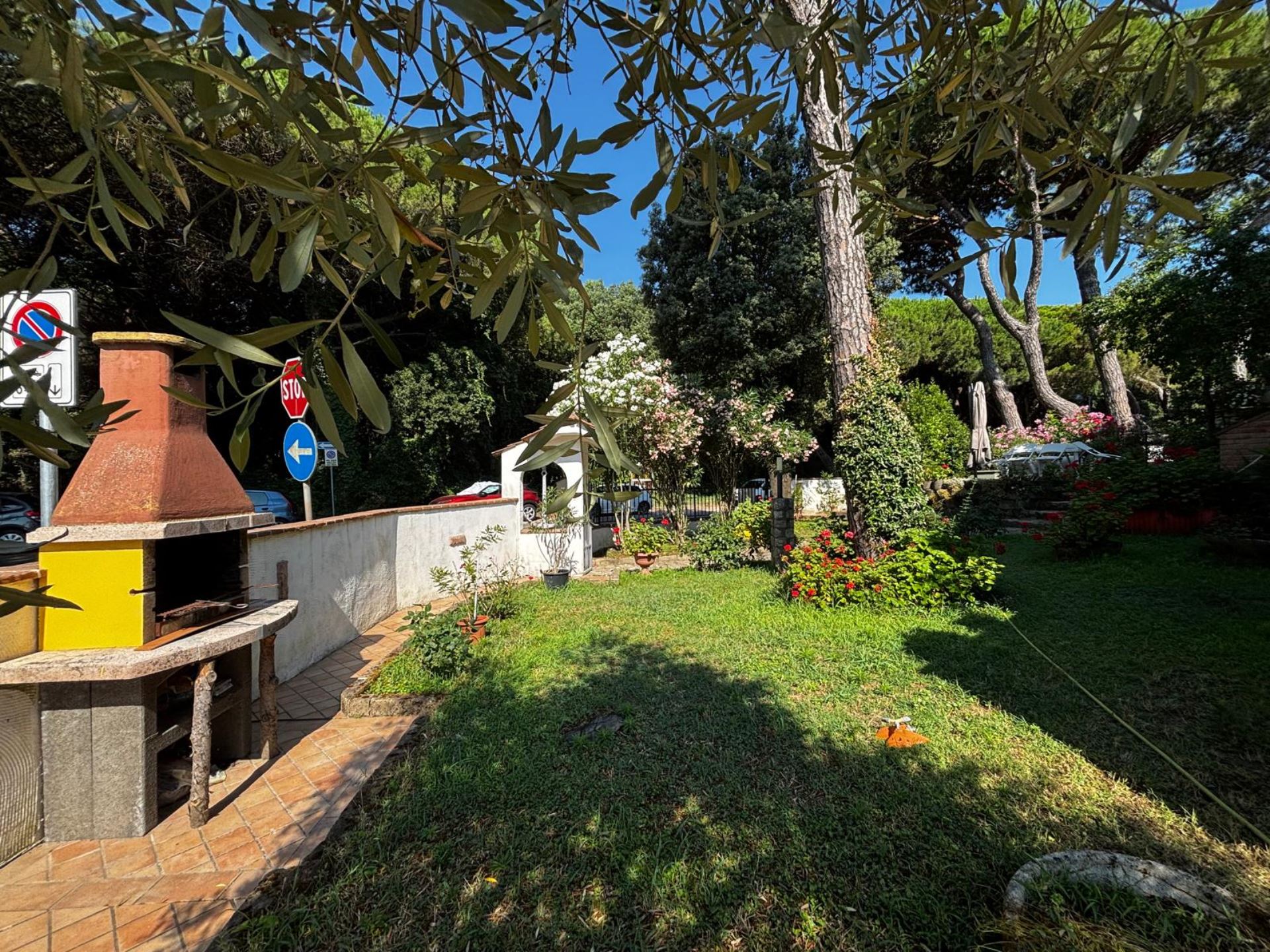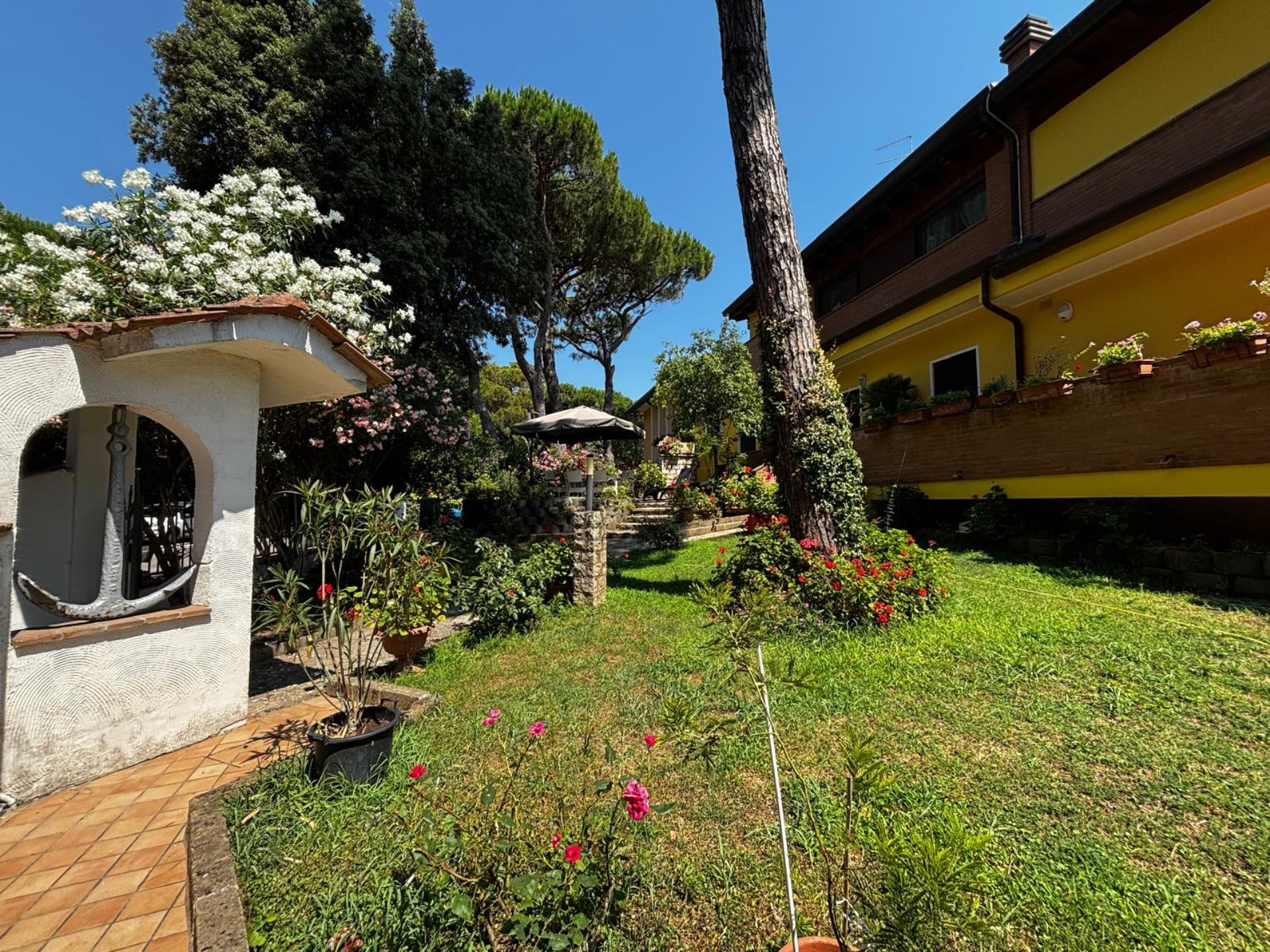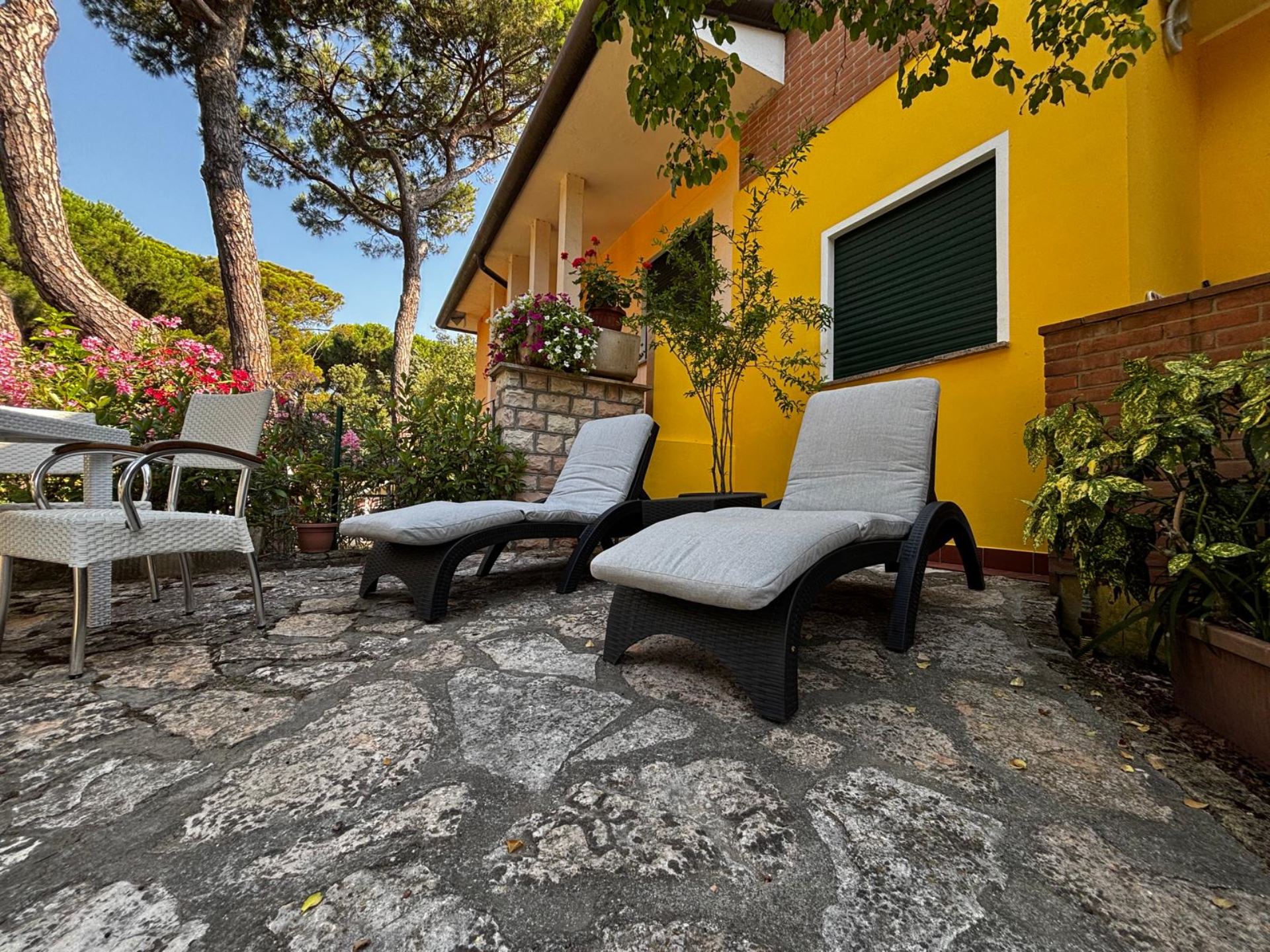 Elegant Villa Portion with Private Garden – Comfort, Space & Relaxation Just 150 m from the Beach. Located just 150 meters from both the beach and the center (Piazza San Giorgio), this beautiful villa portion offers a peaceful setting surrounded by greenery. The property features a large 300 m² private garden with a furnished patio, barbecue, and outdoor dining area—perfect for relaxing moments in the open air. Inside, it includes two spacious bedrooms, each with a double bed and a single bed, an open-plan living room with a fully equipped kitchen and sofa, two modern bathrooms with showers, and two balconies. Amenities include satellite TV, Wi-Fi, air conditioning, washing machine, dishwasher, mosquito screens, microwave, electric kettle, iron with ironing board, hairdryer, and private parking. Ideal for families or small groups (up to 6 guests) seeking a stylish and comfortable seaside holiday. Energy class F – EPgl,nren 209.57 kWh/m² per year