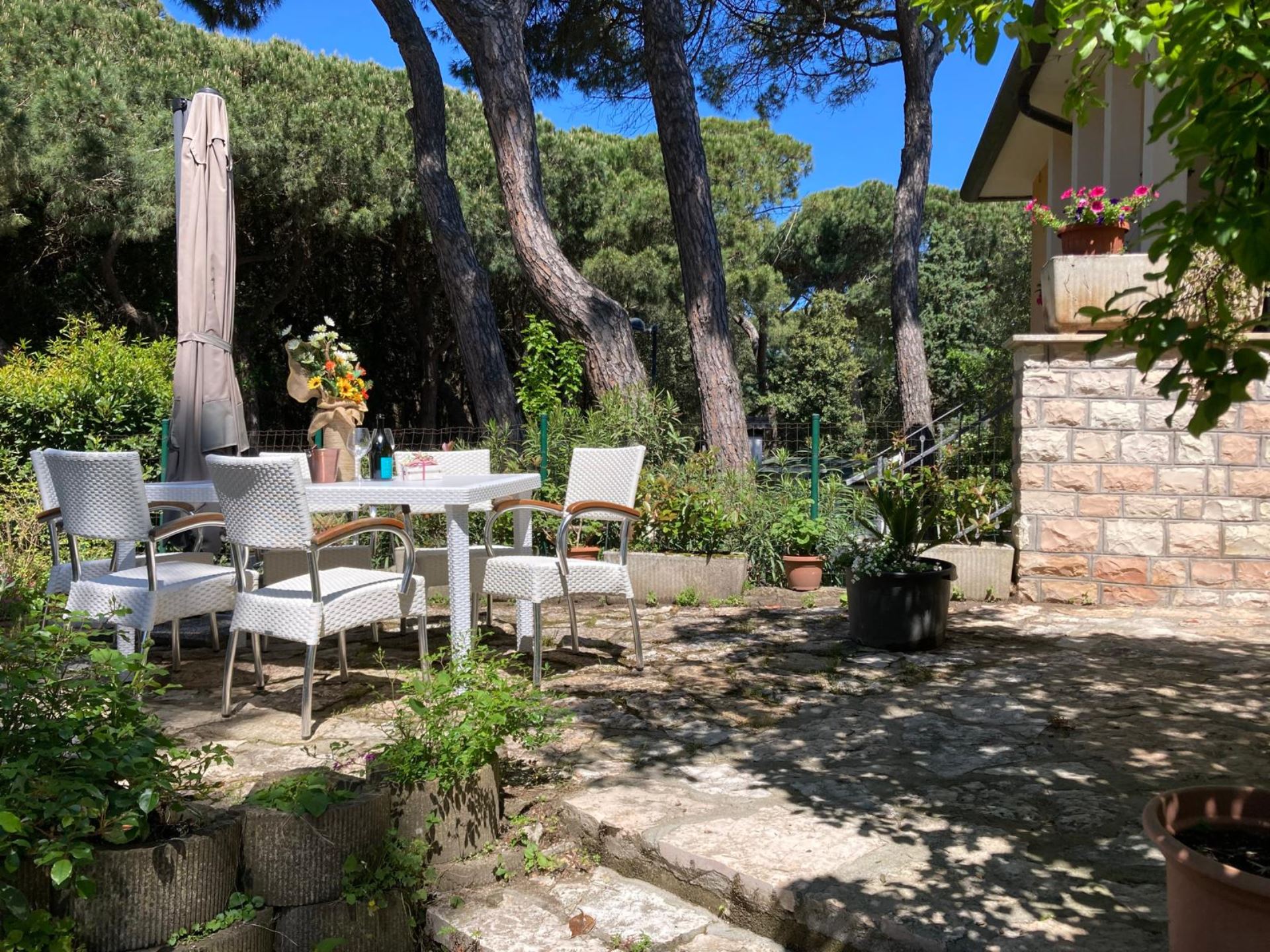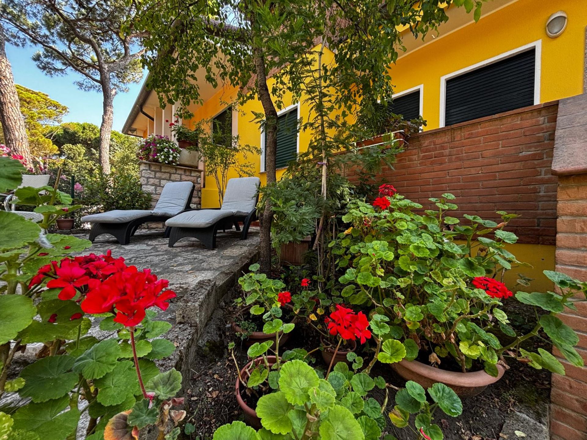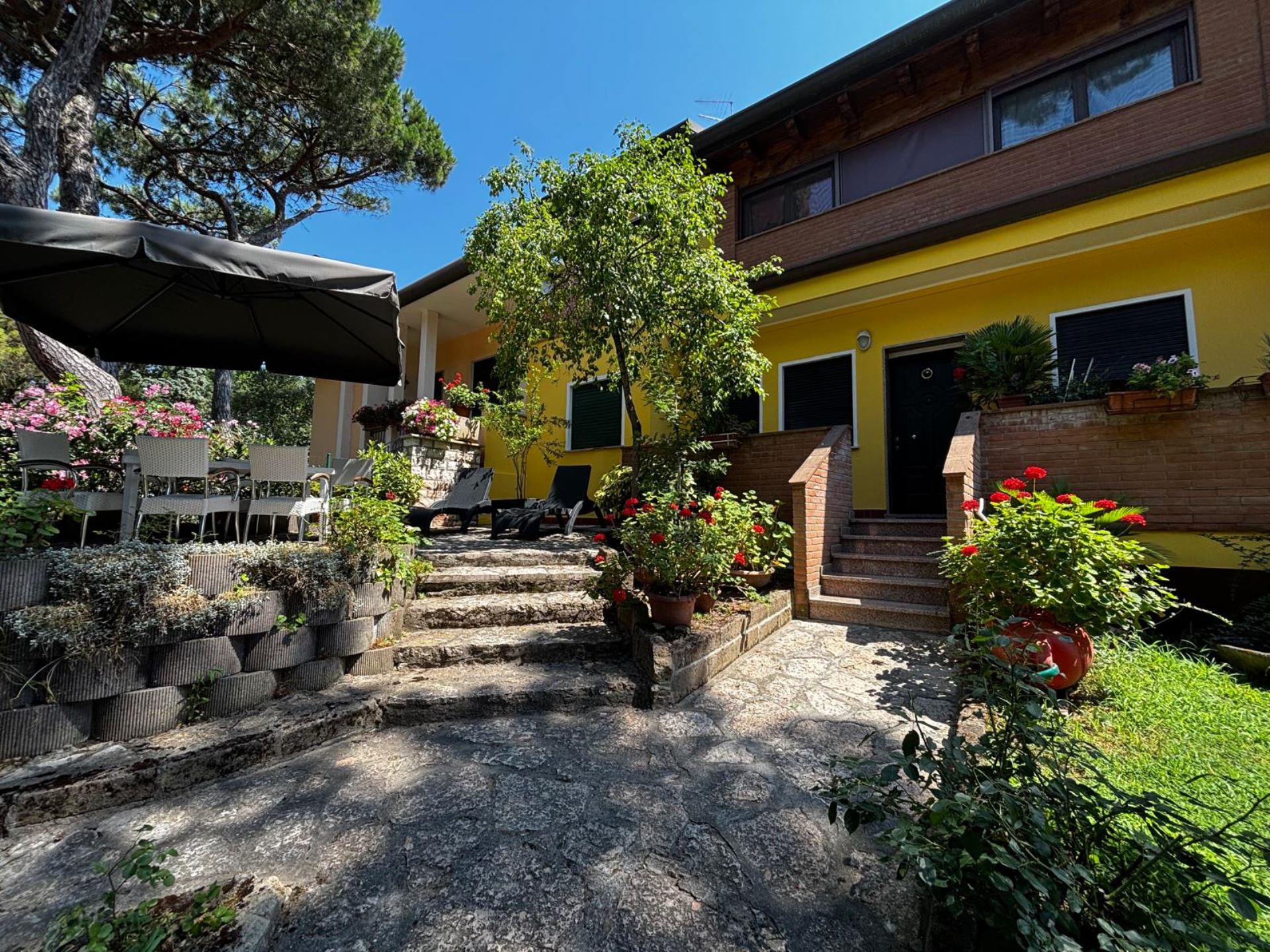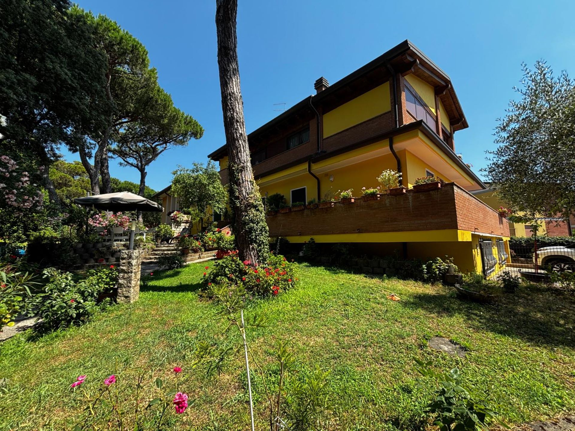 Elegant Villa Portion with Private Garden – Comfort, Space & Relaxation Just 150 m from the Beach. Located just 150 meters from both the beach and the center (Piazza San Giorgio), this beautiful villa portion offers a peaceful setting surrounded by greenery. The property features a large 300 m² private garden with a furnished patio, barbecue, and outdoor dining area—perfect for relaxing moments in the open air. Inside, it includes two spacious bedrooms, each with a double bed and a single bed, an open-plan living room with a fully equipped kitchen and sofa, two modern bathrooms with showers, and two balconies. Amenities include satellite TV, Wi-Fi, air conditioning, washing machine, dishwasher, mosquito screens, microwave, electric kettle, iron with ironing board, hairdryer, and private parking. Ideal for families or small groups (up to 6 guests) seeking a stylish and comfortable seaside holiday. Energy class F – EPgl,nren 209.57 kWh/m² per year