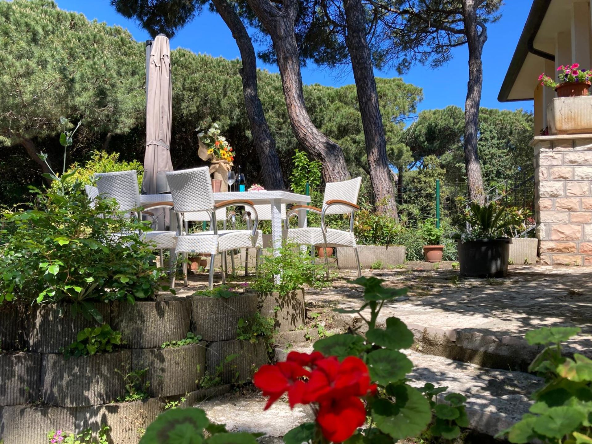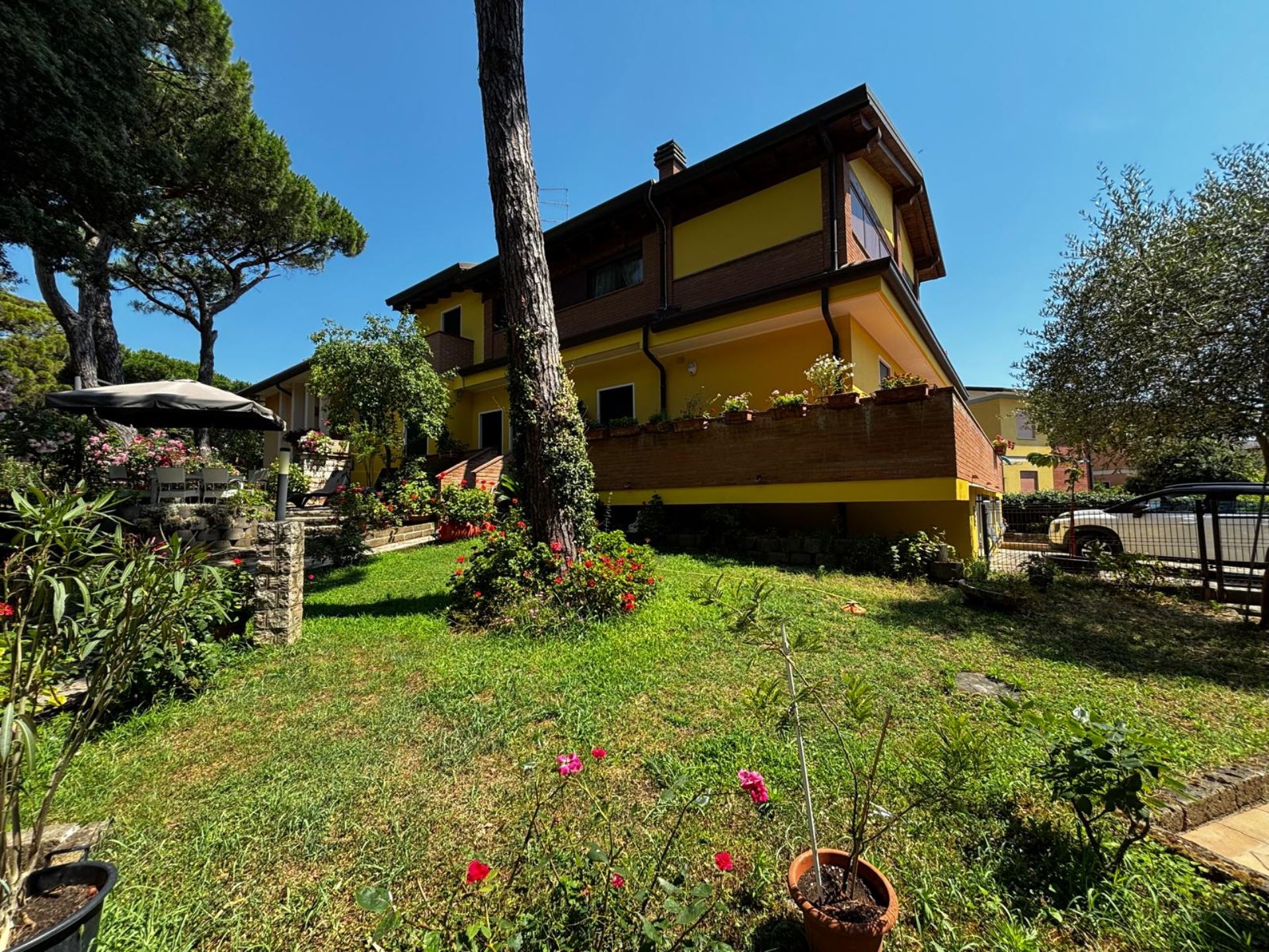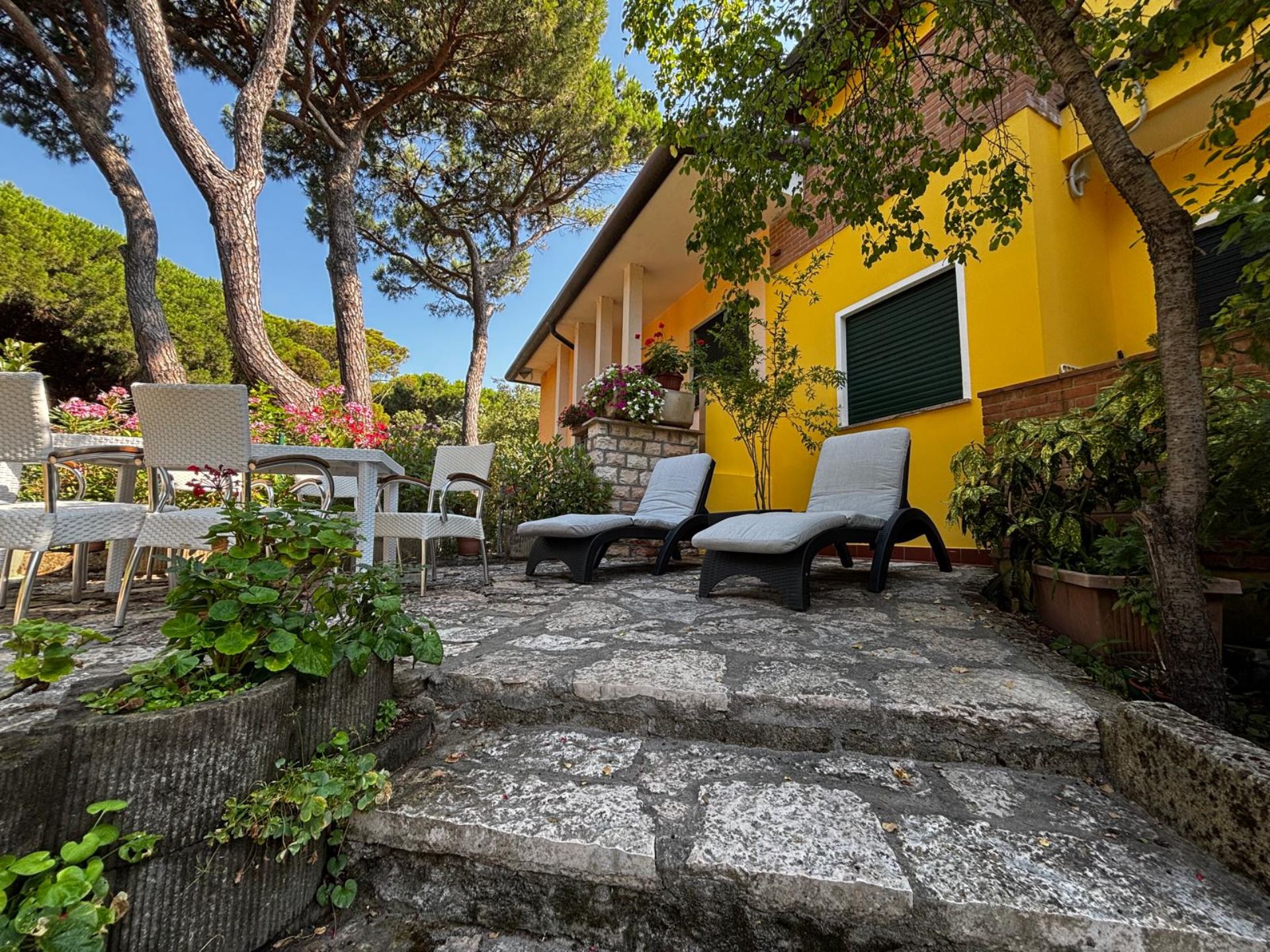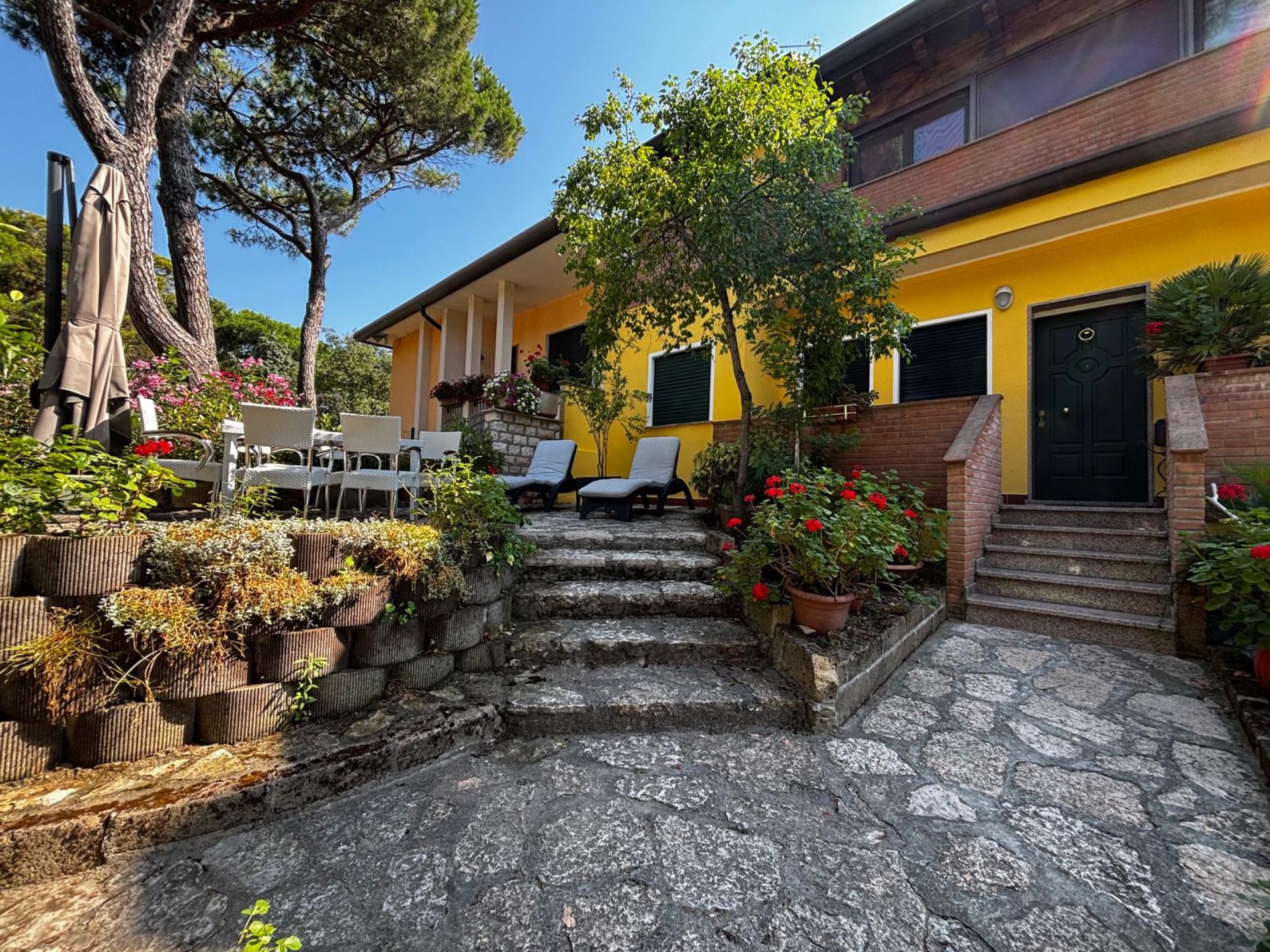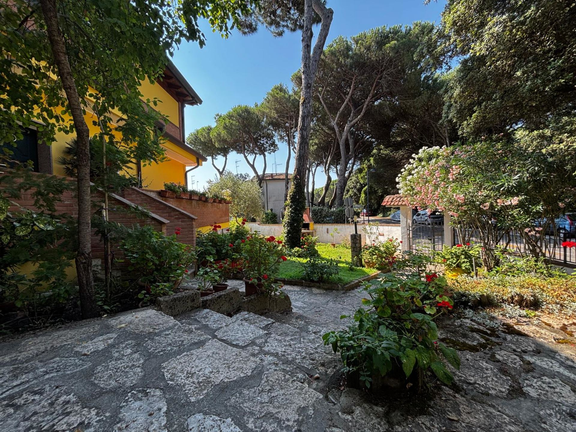 Elegant Villa Portion with Private Garden – Comfort, Space & Relaxation Just 150 m from the Beach. Located just 150 meters from both the beach and the center (Piazza San Giorgio), this beautiful villa portion offers a peaceful setting surrounded by greenery. The property features a large 300 m² private garden with a furnished patio, barbecue, and outdoor dining area—perfect for relaxing moments in the open air. Inside, it includes two spacious bedrooms, each with a double bed and a single bed, an open-plan living room with a fully equipped kitchen and sofa, two modern bathrooms with showers, and two balconies. Amenities include satellite TV, Wi-Fi, air conditioning, washing machine, dishwasher, mosquito screens, microwave, electric kettle, iron with ironing board, hairdryer, and private parking. Ideal for families or small groups (up to 6 guests) seeking a stylish and comfortable seaside holiday. Energy class F – EPgl,nren 209.57 kWh/m² per year
